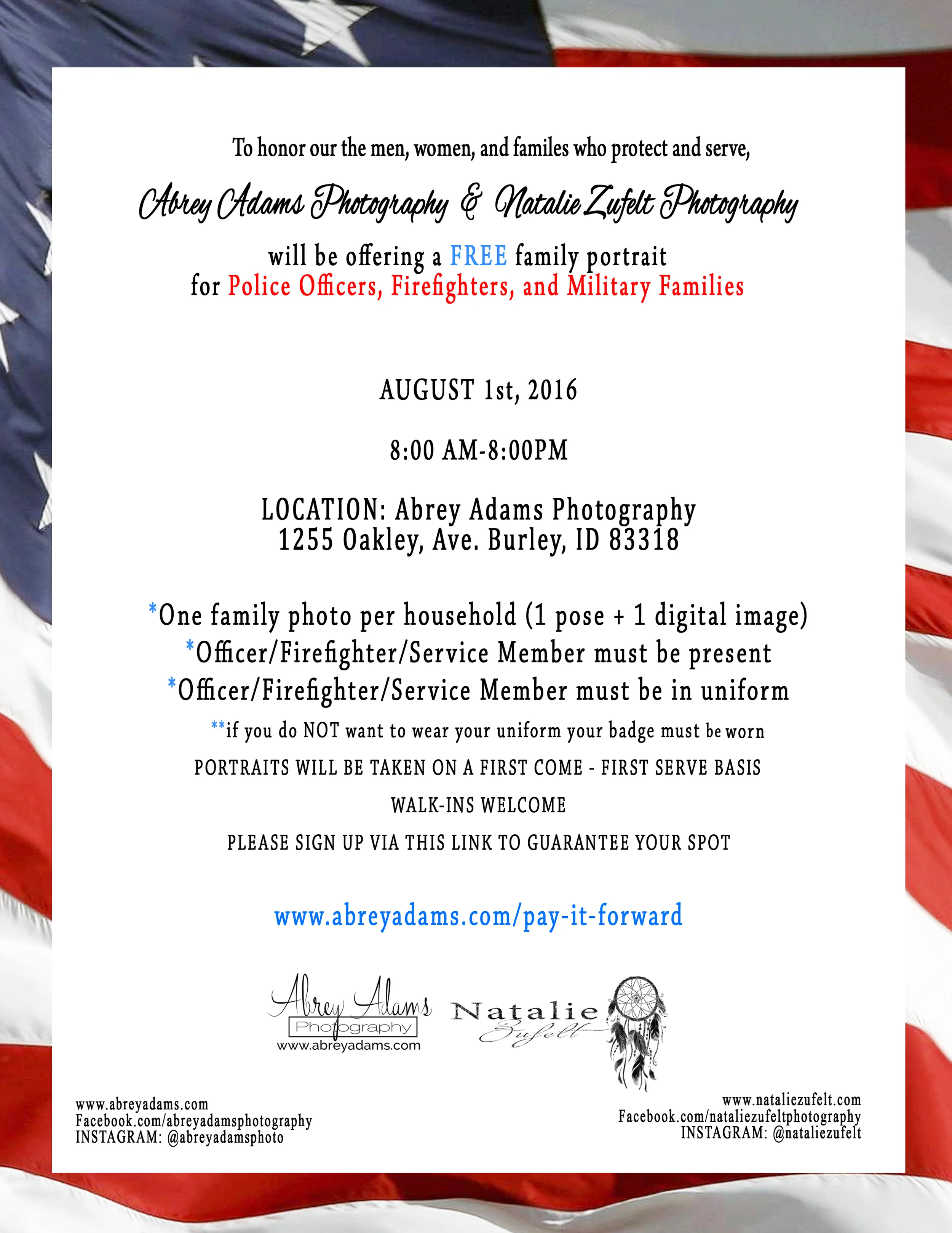 Abrey Adams Photography and Natalie Zufelt Hunsaker are proud to announce that we will be donating our time and services on August 1st, 2016 from 8am-8pm to show our appreciation to our Police Officers, Firefighters, and our Military service members and families. We will be offering a FREE Family Portrait (1 pose + 1 digital image) to those who attend our event. Walk-ins are welcome, but PLEASE utilize this sign up form to help us to prepare our staff and venue for the day! We would like to be as prepared as possible to be able to accommodate you guys and avoid long lines.
